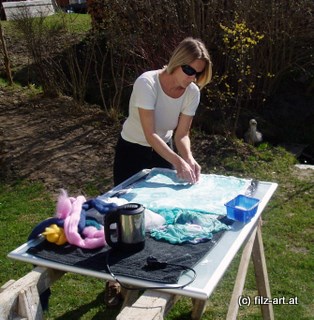 In meinem Garten wiege ich die Wolle, lege die Muster auf und bearbeite die Schafswolle händisch mehrere Stunden mit heißem Wasser und Seife auf einer Schablone. Ist aus der losen Schafswolle ein Wollstoff geworden, ziehe ich die Schablone heraus und walke den Stoff in einem Tuch, bis er schön fest und eben geworden ist und die richtige Größe erreicht hat. Seidenstoffe, z.B. Schals befilze ich beidseitig mit einer feinen Merinowolle.