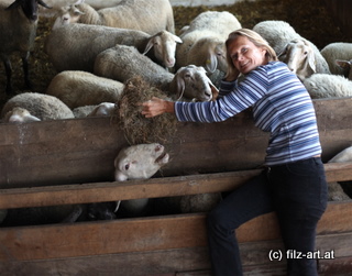 Die Schafswolle beziehe ich von einer hier ansässigen Bäuerin, die die Wolle schonend behandelt, sie meist mit Pflanzenfarben färbt und diese an der Kandiermaschine kämmt. So suche ich mir passende Farben zusammen.